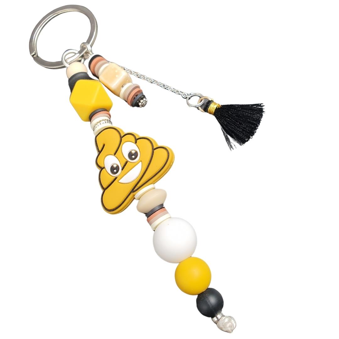 במחזיק משולבים אלמנטים מסיליקון וחרוזים מחומרים שונים כשהאלמט העיקרי הוא אימוג'י של קקי חרדל
